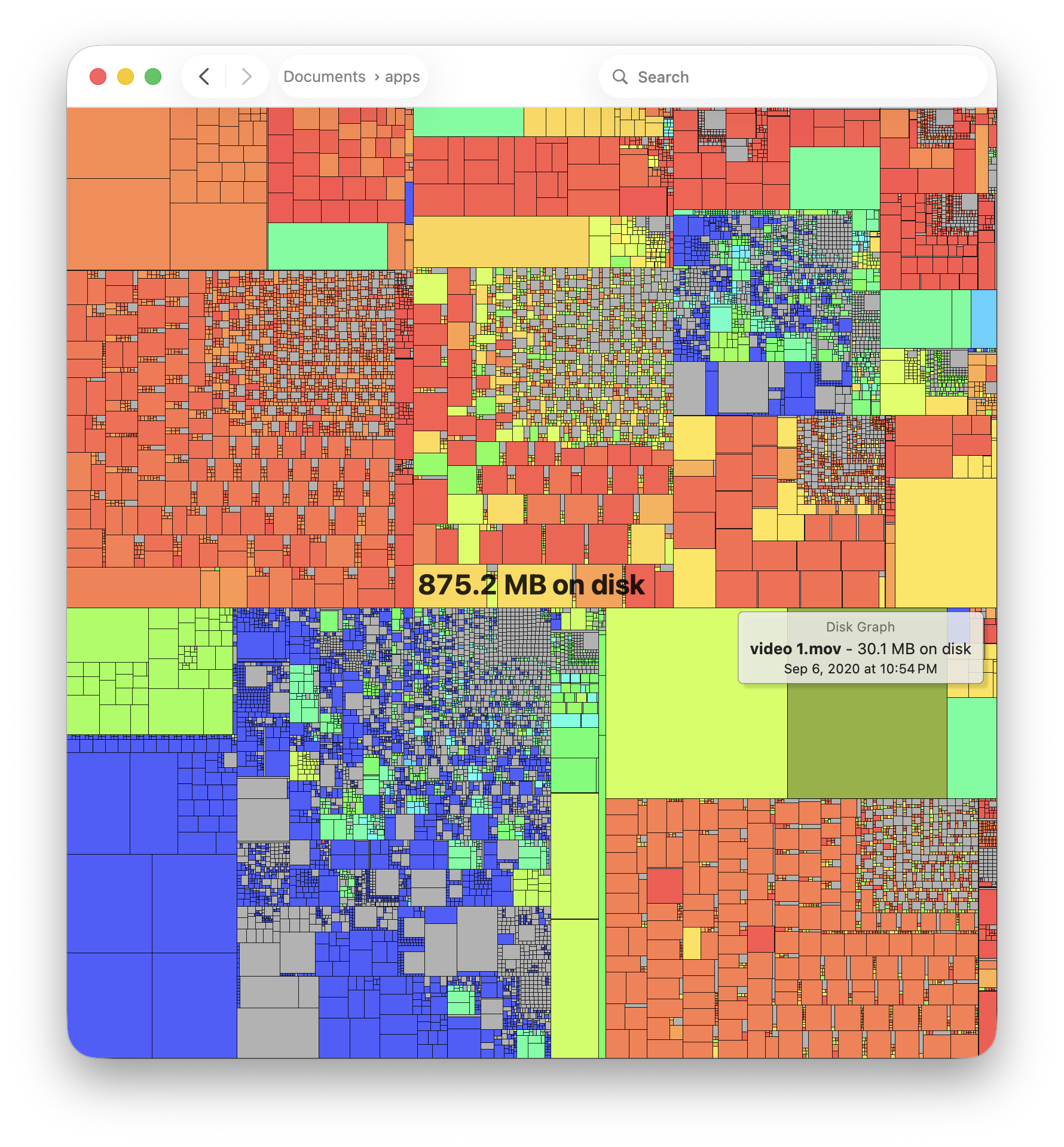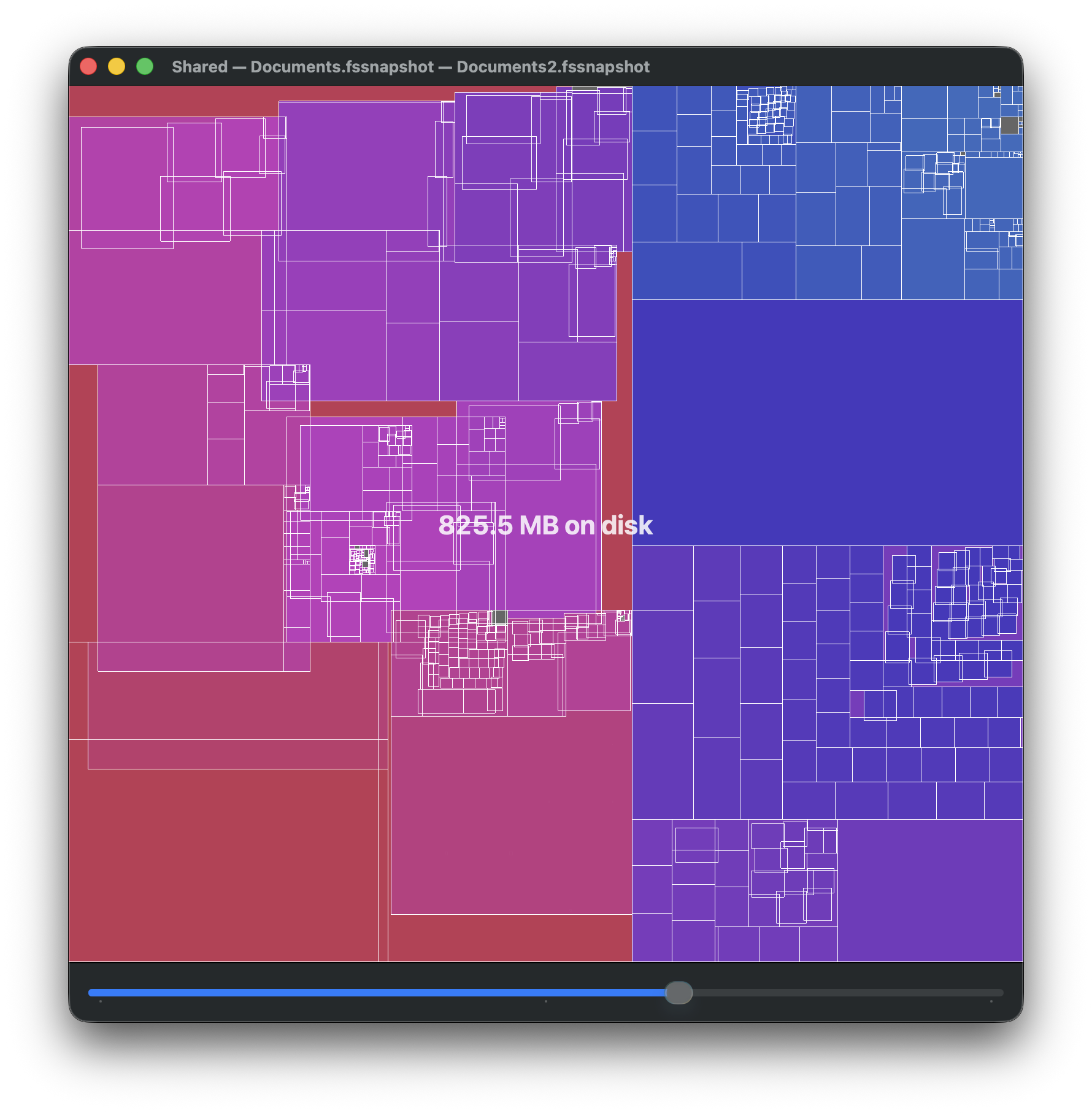Disk Graph can export a scanned volume or directory as a snapshot file. A snapshot can be opened later as if it was a regular directory, so you can see what it contained at that point in time. Multiple snapshots and directories can be opened as a file sequence: an interactive animation that shows the transition between the selected snapshots and directories.