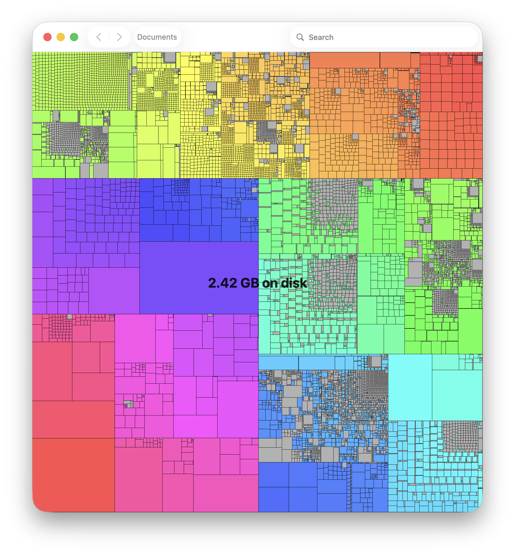 You can switch anytime to the tree map, which displays all files regardless how deep they are inside the directory. Just like in the pie chart, files that are too small to show individually are grouped in gray sections.
