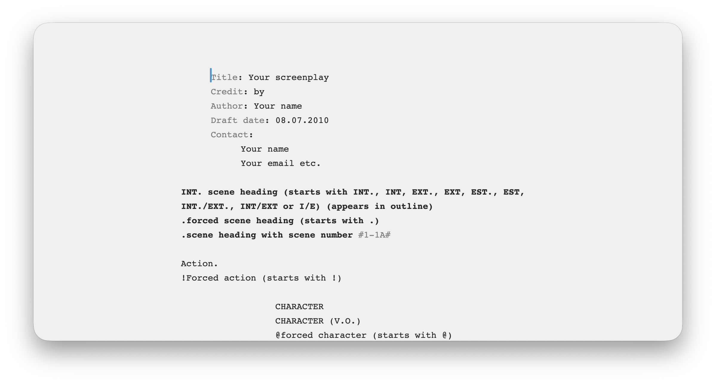 You can see the supported Fountain features by opening the uFocus Introduction from the Help menu, scrolling down to the Document types > Fountain section, then selecting the Open Fountain cheat sheet link.