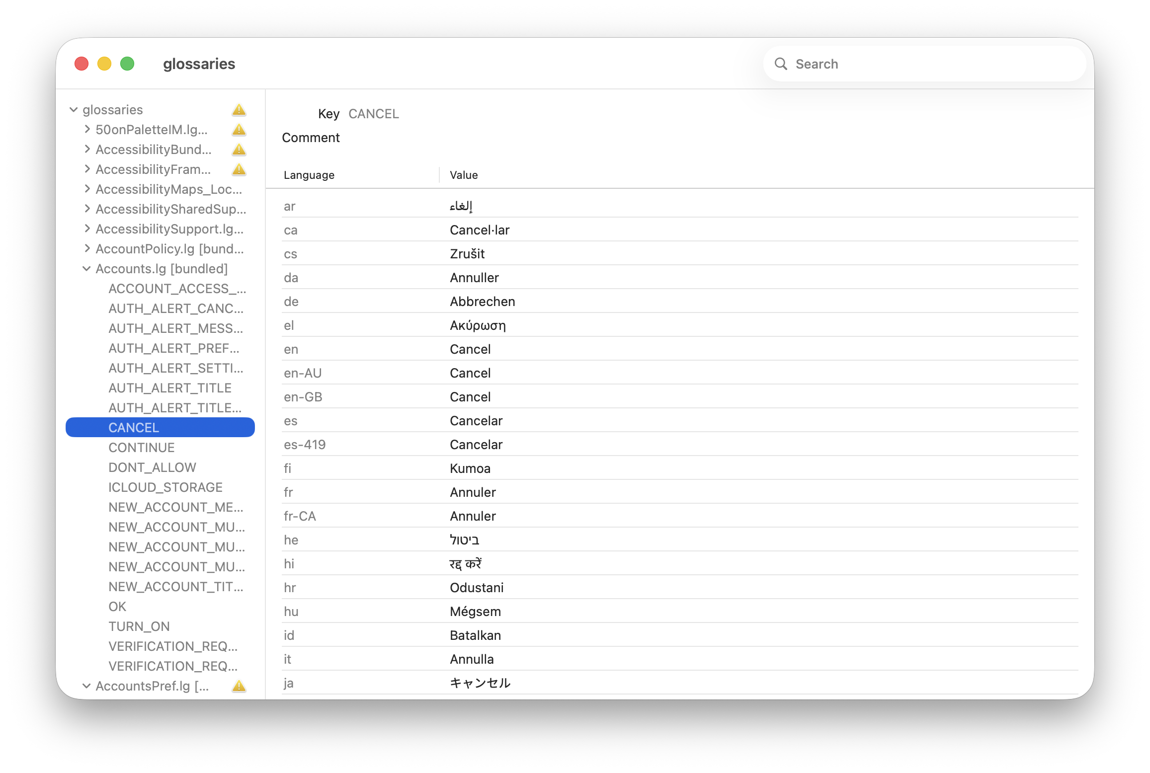 Localiji also offers a useful feature independent of App Store Connect: it can open Apple glossary files and allows you to copy individual keys with all translations into your app’s Localizable.xcstrings file. See Integrate official Apple glossary into your app for more information.