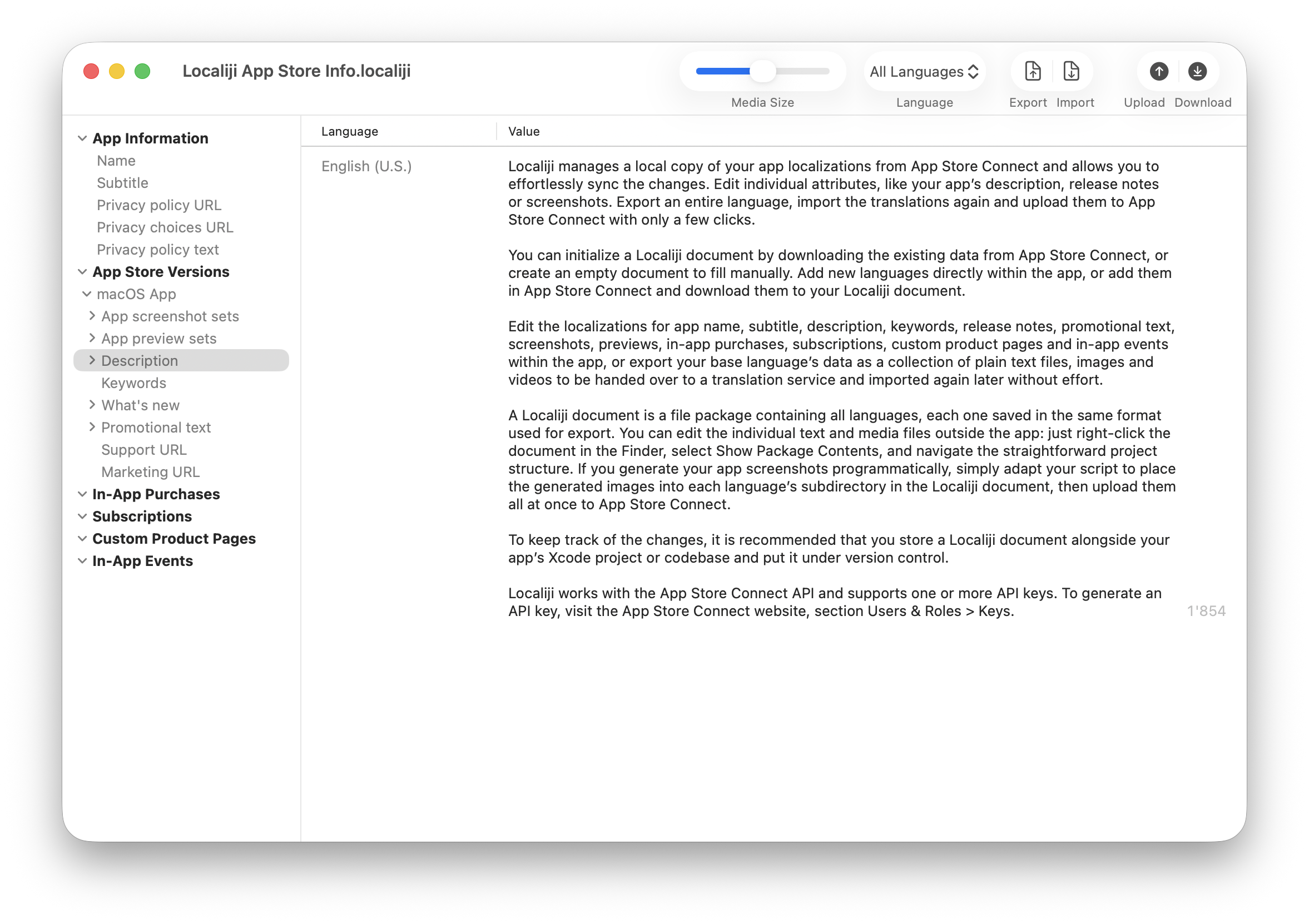 You can initialize a Localiji document by downloading the existing data from App Store Connect, or create an empty document to fill manually. Add new languages directly within the app, or add them in App Store Connect and download them to your Localiji document.