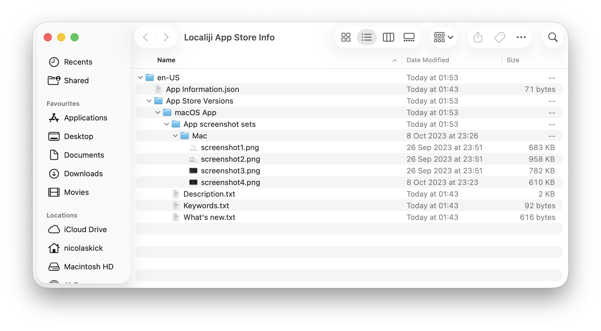 A Localiji document is a file package containing all languages, each one saved in the same format used for export. To navigate the straightforward project structure, simply right-click the document in the Finder and select Show Package Contents. You can edit the individual text and media files in your favorite editor or resort to symbolic links to use your base language as the default for individual files of other languages, such as the What’s new text. If you generate your app screenshots programmatically, simply adapt your script to place the generated images into each language’s subdirectory in the Localiji document.