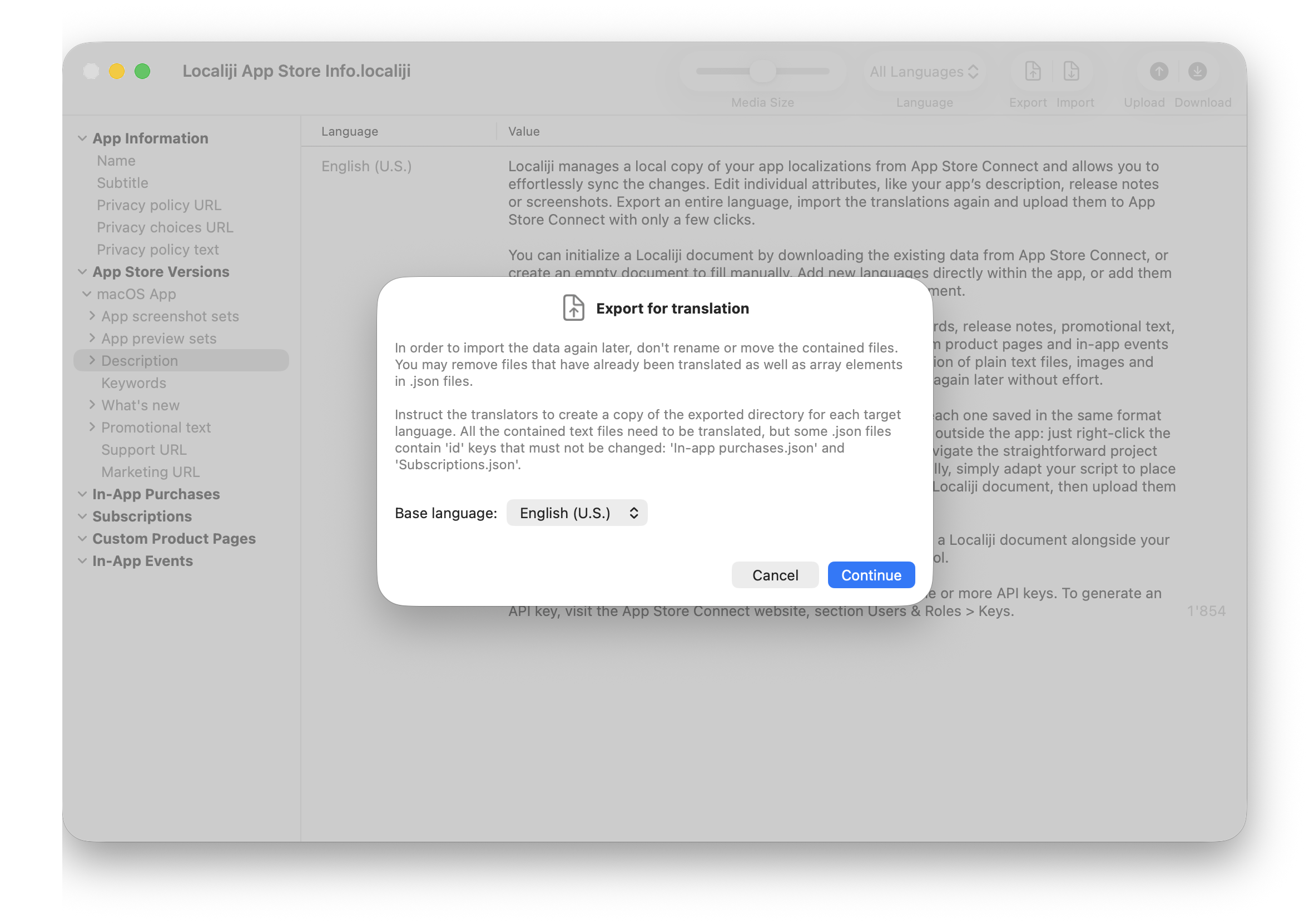 Edit the localizations for app name, subtitle, description, keywords, release notes, promotional text, screenshots, previews, in-app purchases, subscriptions, custom product pages and in-app events within the app, or export your base language’s data as a collection of plain text and JSON files, images and videos to be handed over to a translation service.