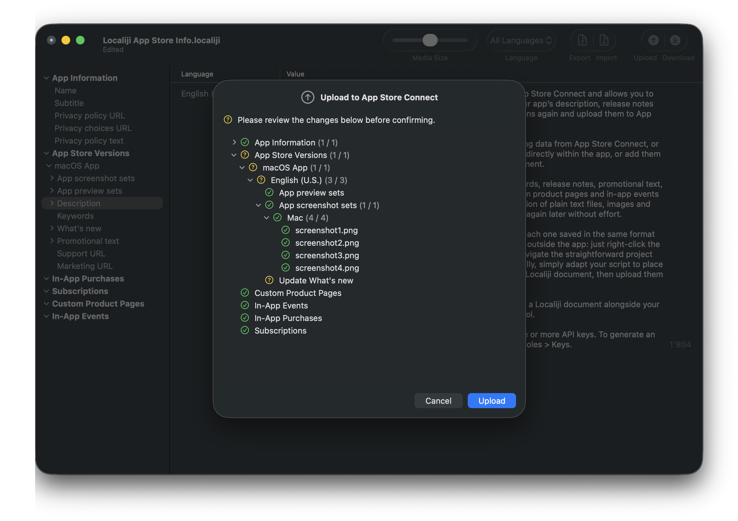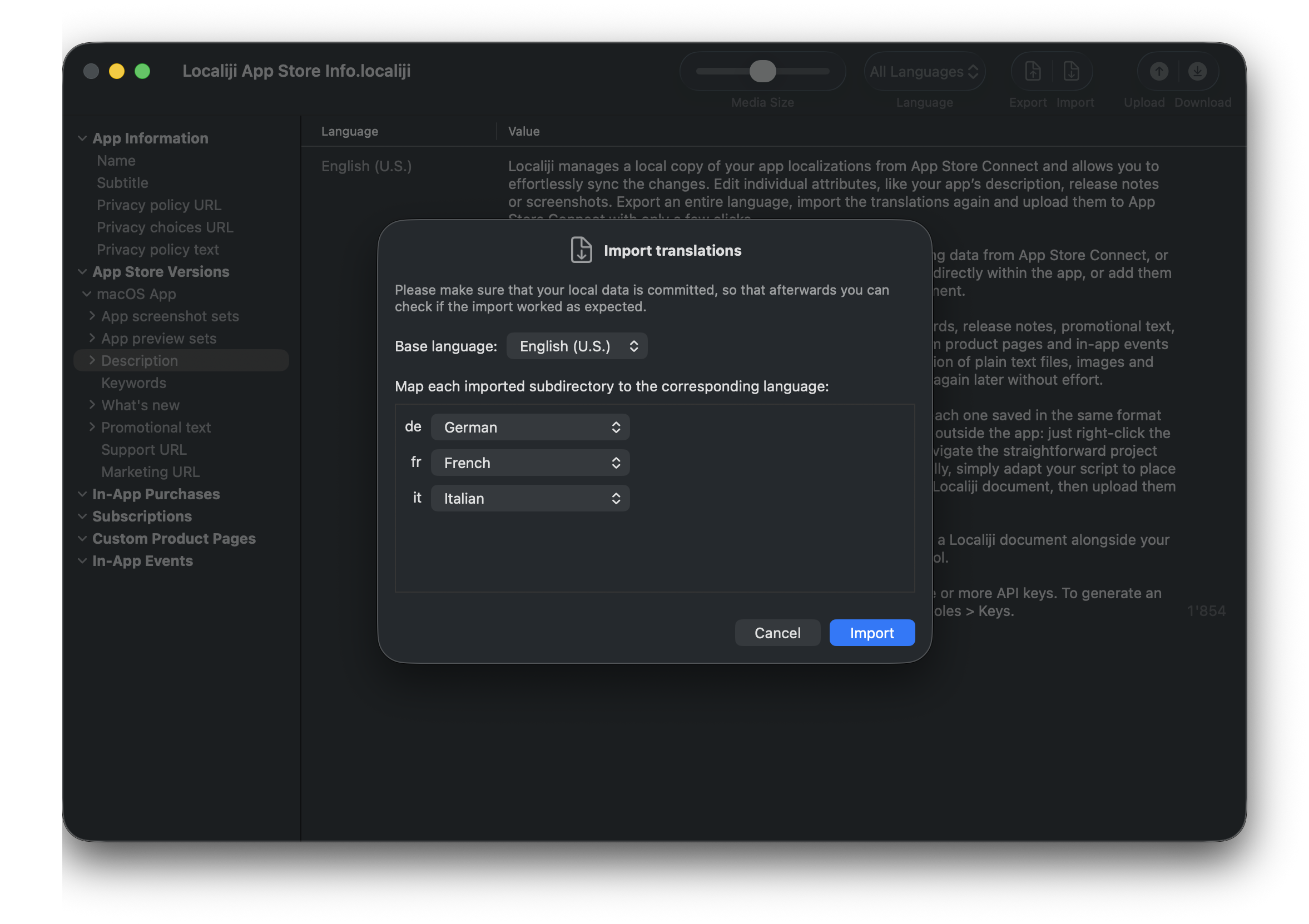 Localiji manages a local copy of your app localizations from App Store Connect and allows you to effortlessly sync the changes. Edit individual attributes, like your app’s description, release notes or screenshots. Export an entire language, import the translations again and upload them to App Store Connect with only a few clicks.