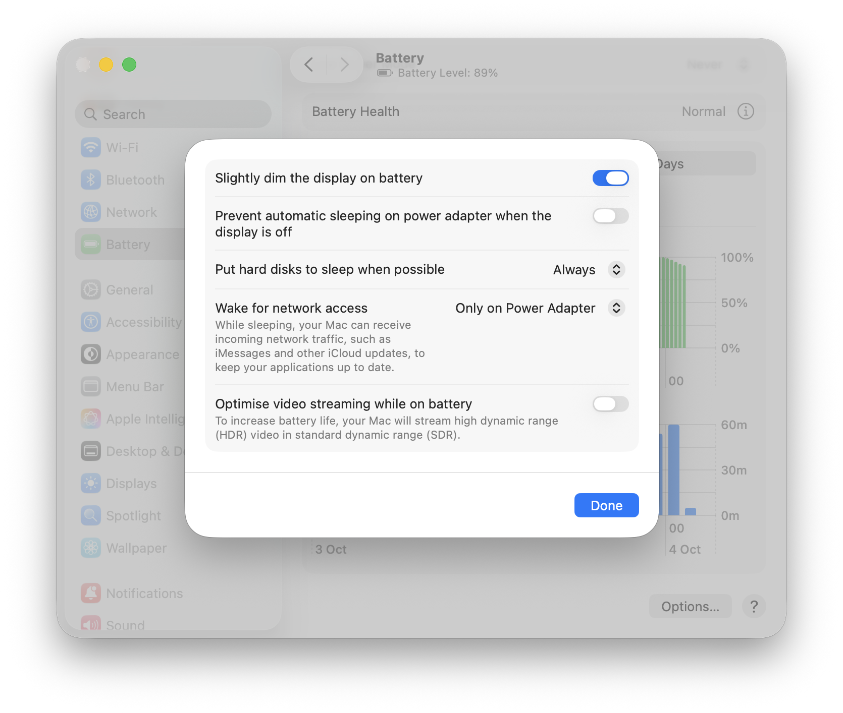 When the Screen Saver starts, the Mac is still awake and syncs can still run. When the display is turned off, the Mac might still remain awake for some time, but can go to sleep as soon as no process prevents it from doing so. To actively prevent automatic sleep when the display is turned off and the Mac is connected to the power adapter, in System Settings, under Battery, click on Options (at the bottom) and enable the option Prevent automatic sleeping on power adapter when the display is off. On macOS 15 and older, it’s located under Displays, then click on Advanced.