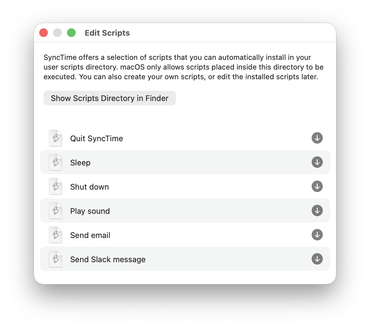 SyncTime offers some predefined scripts that you can automatically install in your user scripts directory. macOS only allows scripts inside this directory to be executed. You can also create your own scripts (see below), or edit the installed scripts.