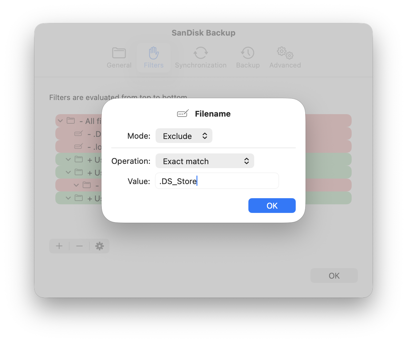 Like the All files filter, a File or directory filter can have nested filters. When adding a new File or directory filter, it is added automatically to the nearest ancestor. All other filters are added either to the currently selected filter (or to its parent, if the currently selected filter is not a File or directory filter) or, if the selection is empty, to All files.