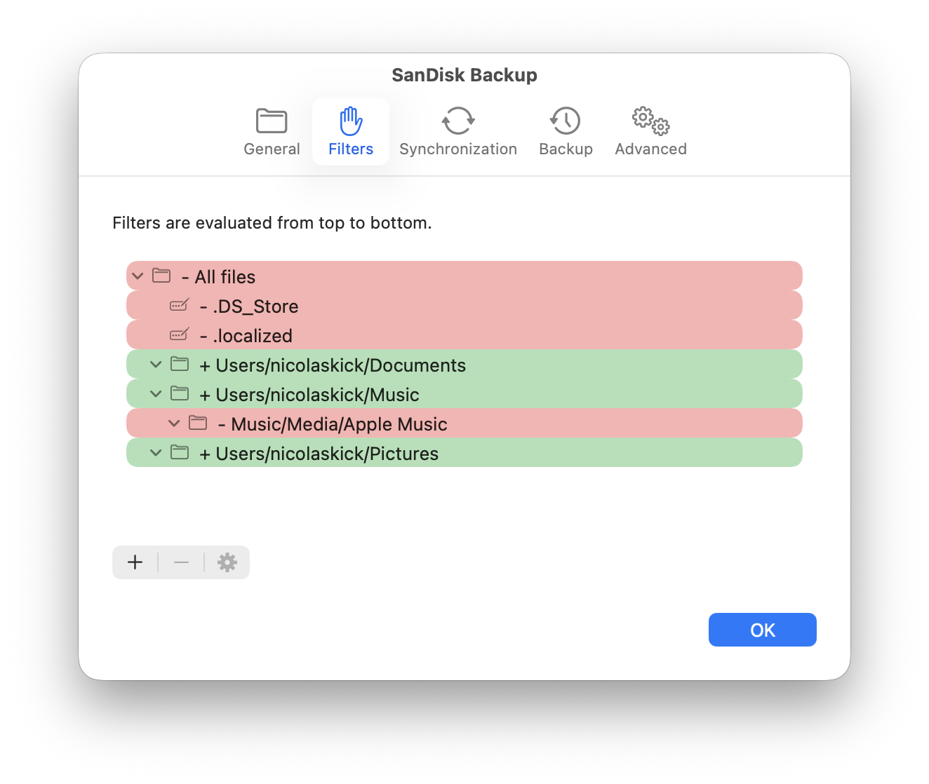Tip: as a means of grouping many sync items with a common parent directory and the same settings, you can exclude the source directory itself and include the subdirectories you want to sync. For example, if you only want to sync your Documents, Music and Pictures directories but ignore all other files contained in your home directory, select the home directory as the source, set the Mode of the All files filter to Exclude, then add a File or directory filter for each subdirectory (Documents, Music and Pictures) with Mode set to Include.