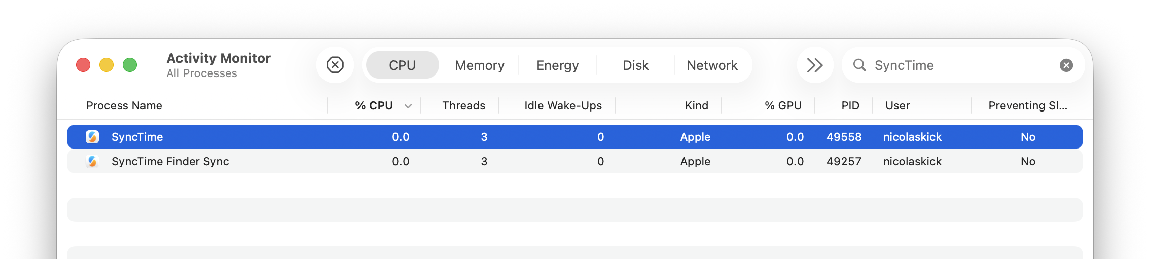 By default, SyncTime appears both in the Dock and as a Menu Bar icon. Only apps that appear in the Dock are listed in the Force Quit window ( > Force Quit). If you disabled the option to show SyncTime in the Dock, in order to force quit it: