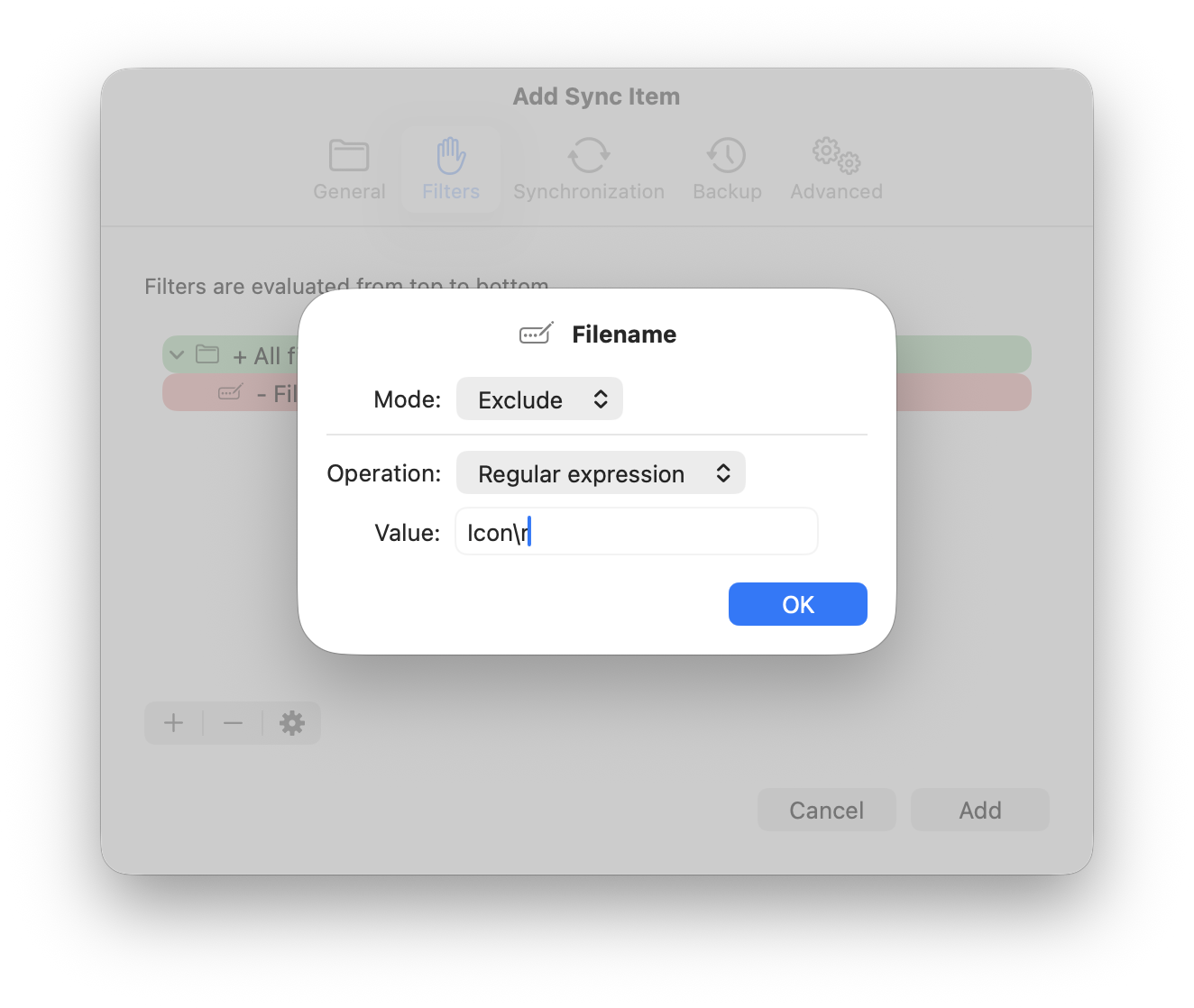 Even if custom icon files are hidden in the Finder, excluding hidden files in SyncTime will not exclude custom directory icons from a sync. To exclude custom directory icons, add a Filename filter with Mode set to Regular expression and Value set to “Icon\r”.