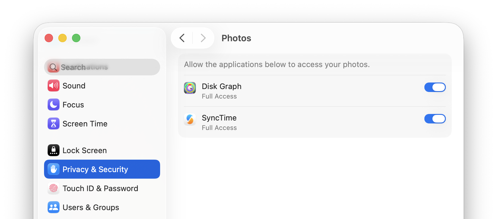 You can enable access to the Photos Library again by quitting SyncTime, then opening System Settings, navigating to Privacy & Security > Photos, and enabling the switch beside SyncTime.