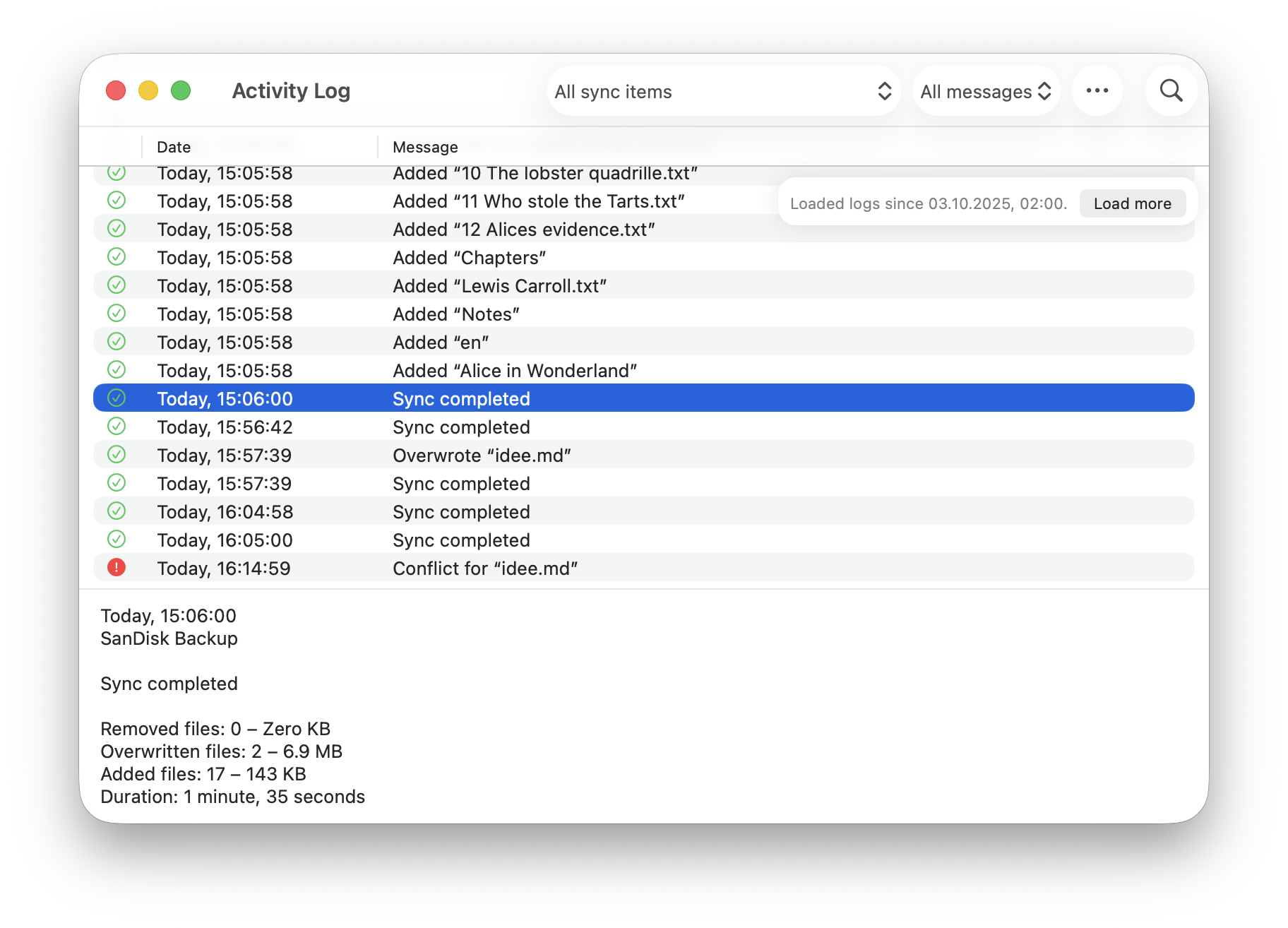 To minimize memory usage, when opening the Activity Log window only the most recent logs are shown. Older logs can be loaded by clicking on Load more in the upper right corner of the log list.