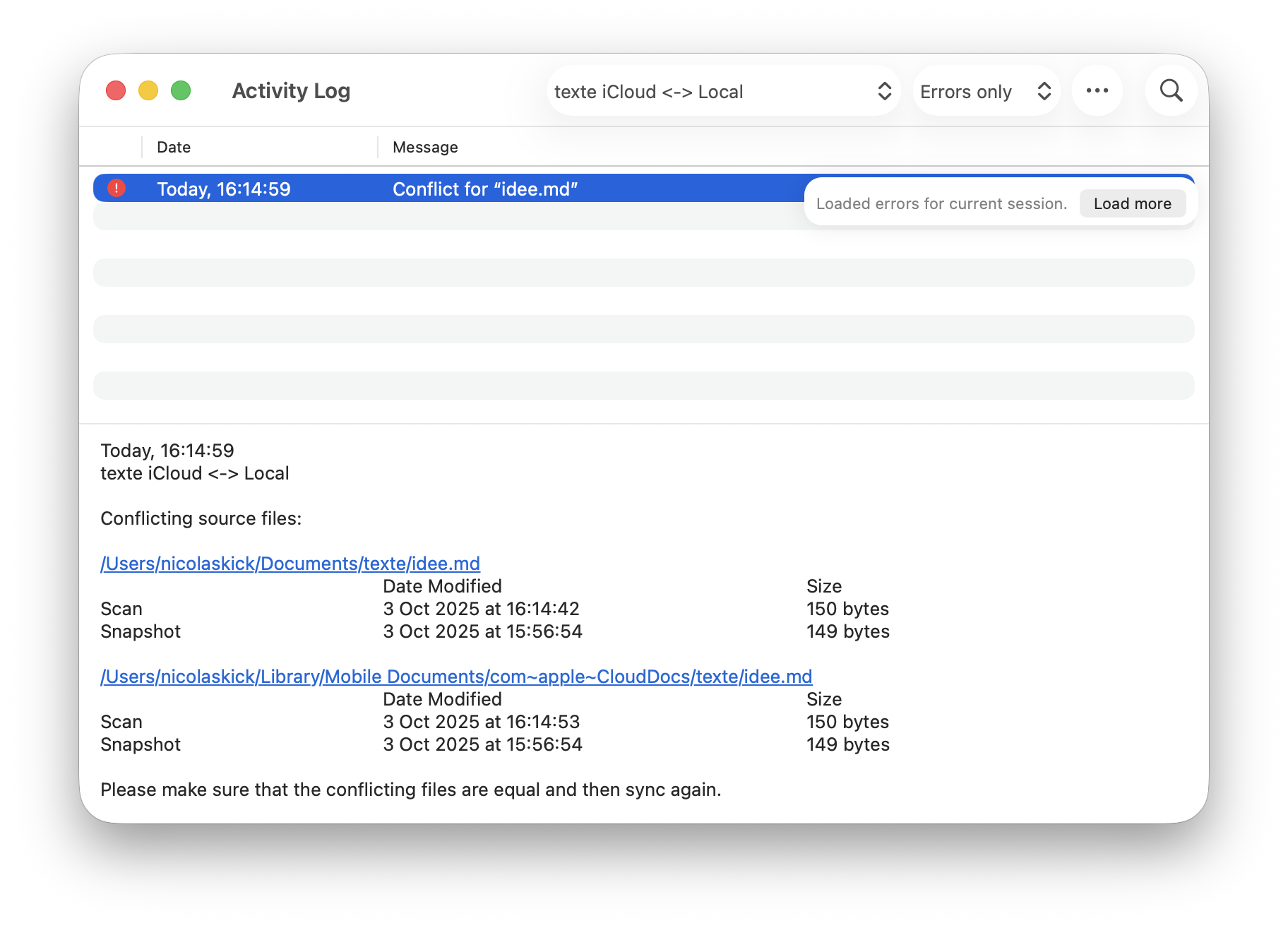 A conflict error allows you to understand the cause by showing the modification date and size of the relevant files on disk and in the snapshots (for two-way syncs). To resolve the conflict, choose which file you want to keep in the Finder and copy it over the other file.