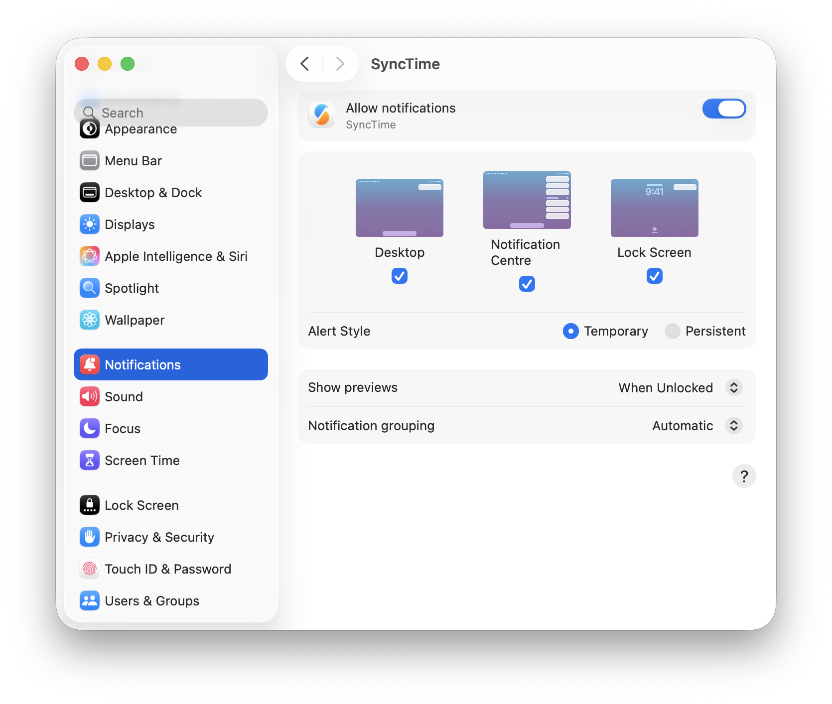 SyncTime always sends system notifications when an error occurs as well as when a sync completes successfully. By default, macOS hides notifications automatically after a short amount of time. To keep notifications visible until explicitly dismissed, you can change the notification type from Banners to Alerts in the System Settings.